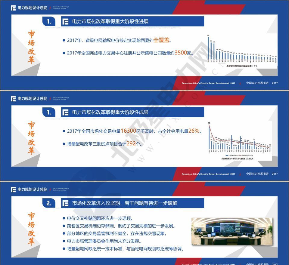 《報告》分十個篇章,從發(fā)展環(huán)境、需求分析、電源發(fā)展、電網(wǎng)發(fā)展、供需形勢、電力技術(shù)、電力經(jīng)濟(jì)、電力改革、政策解讀、熱點(diǎn)研究等多個方面對2017年我國電力發(fā)展?fàn)顩r進(jìn)行全面梳理、綜合歸納,分析預(yù)測了未來三年電力需求水平,并在此基礎(chǔ)上提出了各類電源、各級電網(wǎng)發(fā)展展望;深入解讀了過去一年重點(diǎn)行業(yè)政策及電價政策;在全面總結(jié)電力體制改革進(jìn)展的基礎(chǔ)上,分析展望了近期改革重點(diǎn);在總結(jié)上年度電源電網(wǎng)造價水平基礎(chǔ)上,對未來三年電力工程造價變化趨勢進(jìn)行了分析判斷;以專題文章形式深入剖析了新能源消納、電力現(xiàn)貨市場建設(shè)等當(dāng)前電力行業(yè)熱點(diǎn)焦點(diǎn)問題。