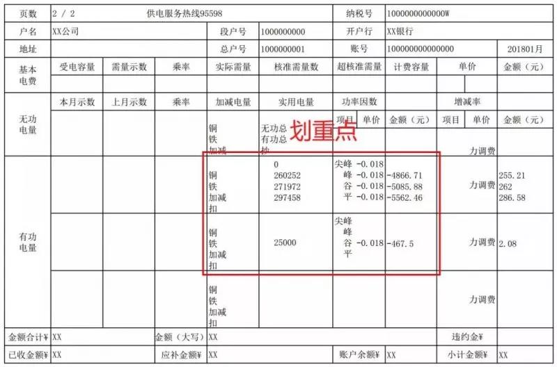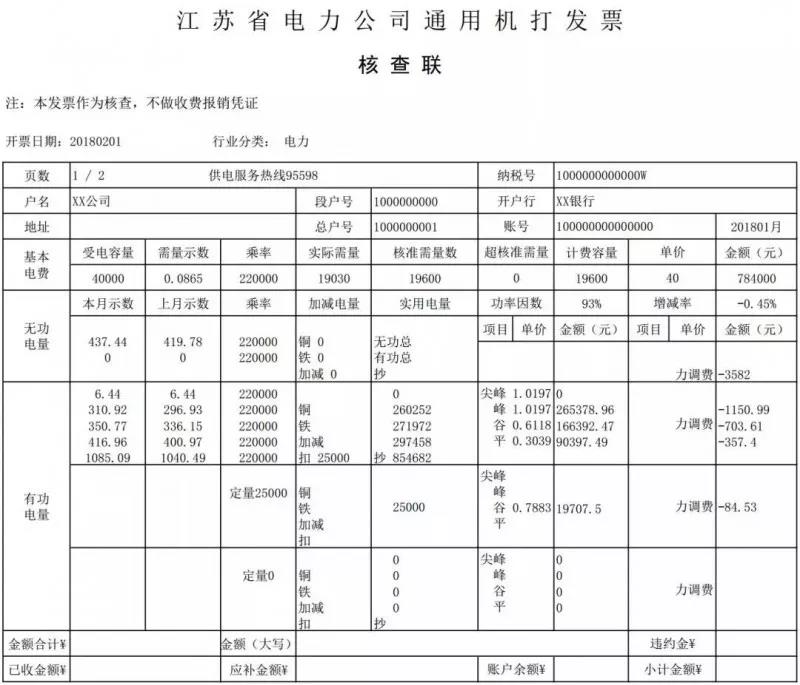 接下來我們翻到第二頁,這時我們發(fā)現(xiàn),第一頁中的峰平谷電量和定量25000千瓦時電量再次出現(xiàn)了,而且對應的單價是一個負數(shù)。沒錯,這就是咱們當月的優(yōu)惠電量了。江蘇省2018年電力市場用戶是全電量參與,因此咱們的每一度電都可以享受到優(yōu)惠。這里要注意,有的用戶會出現(xiàn)多行數(shù)據(jù),產生多頁核查聯(lián),但前后數(shù)據(jù)一定是一一對應的哦。