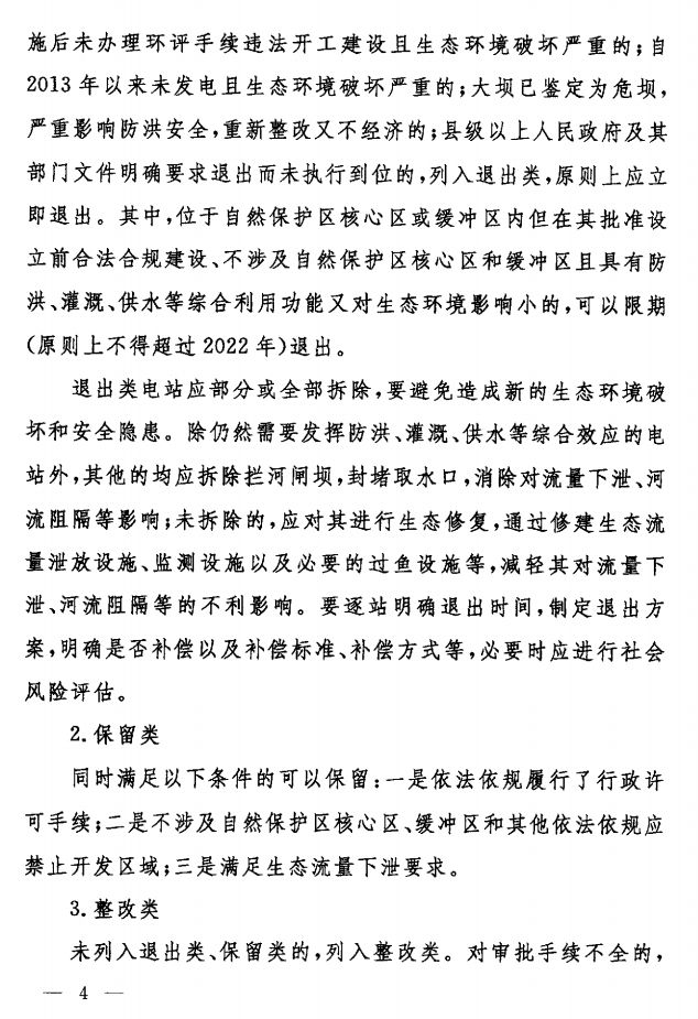 總體目標(biāo):限期退出涉及自然保護(hù)區(qū)核心區(qū)或緩沖區(qū)、嚴(yán)重破壞生態(tài)環(huán)境的違規(guī)水電站,全面整改審批手續(xù)不全、影響生態(tài)環(huán)境的水電站,完善建管制度和監(jiān)管體系,有效解決長(zhǎng)江經(jīng)濟(jì)帶小水電生態(tài)環(huán)境突出問(wèn)題,促進(jìn)小水電科學(xué)有序可持續(xù)發(fā)展。2020年底前完成清理整改。