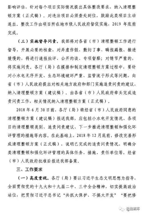 通知要求,全面排查長江經濟帶范圍的上海、江蘇、浙江、安徽、江西、湖北、湖南、重慶、四川、貴州、云南等11?。ㄊ校┬∷姡êL江水系以外的小水電,小水電是指單站裝機容量在5萬千瓦及以下的水電項目)開發(fā)及環(huán)評管理情況。針對未批先建、生態(tài)環(huán)境破壞嚴重、監(jiān)管不到位等問題,實施分類清理整頓,同步開展生態(tài)修復,依法嚴厲查處,嚴肅追責問責。