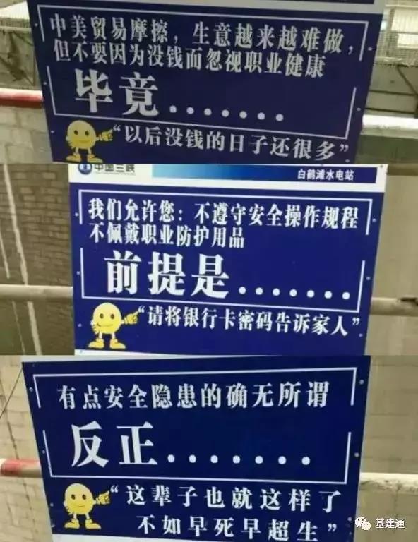 不管做什么,安全第一,而水電八局在白鶴灘水電站建設(shè)現(xiàn)場(chǎng)連施工安全標(biāo)語都與眾不同,通哥收集了部分標(biāo)語供各位基友“感慨”,通哥看了這些標(biāo)語,感慨超級(jí)工程的同時(shí),也默默地為建設(shè)者們豎起了大拇指,你們真不容易,辛苦了!