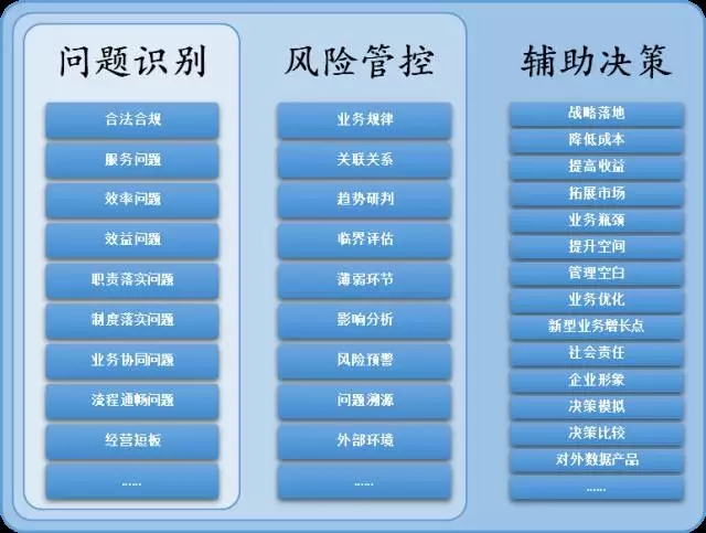 在感知與預(yù)防之上,是對企業(yè)運(yùn)營的輔助決策(主動參謀),即對可能提升公司經(jīng)營效果的業(yè)務(wù)空間或管理措施進(jìn)行分析和評估,為經(jīng)營管理者提供決策參謀。與具體問題的感知和預(yù)防相比,這一角度會在更大層面上影響企業(yè)的決策和業(yè)務(wù)變革方向。