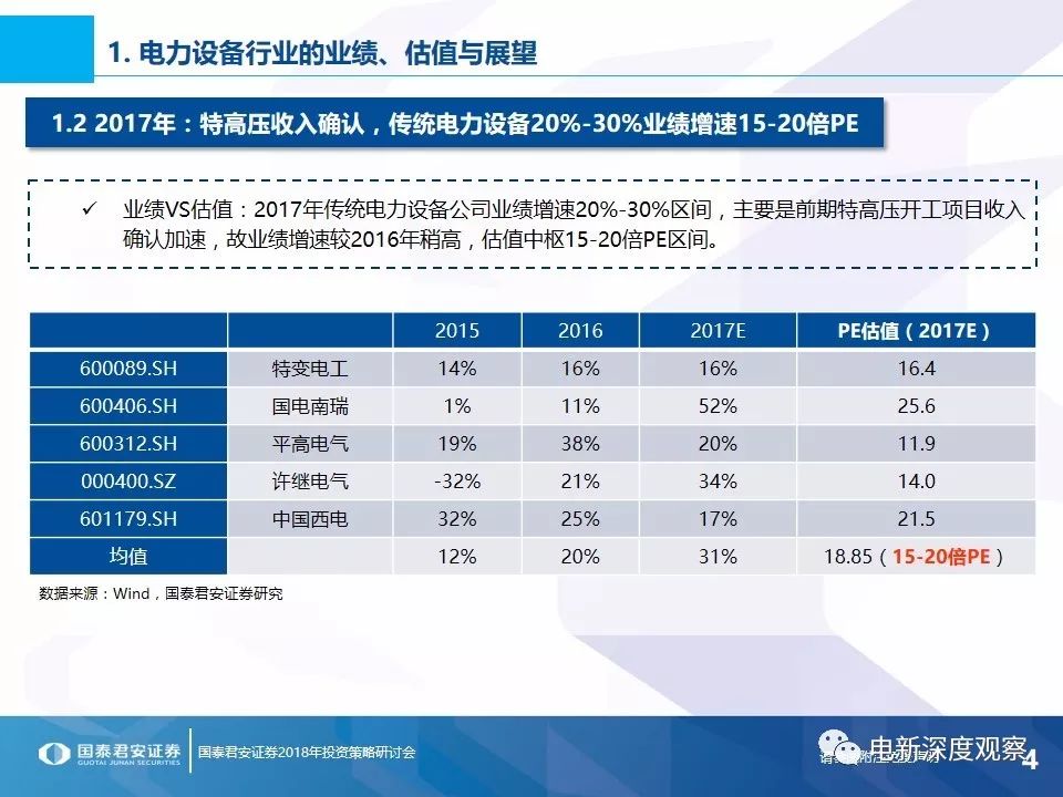 投資要點(diǎn)1 電力設(shè)備行業(yè)的業(yè)績、估值與展望傳統(tǒng)電力設(shè)備十年業(yè)績VS估值:2016-2017年電力設(shè)備公司定增倒掛較為普遍,許繼、平高、特變?nèi)覀鹘y(tǒng)電力設(shè)備龍頭均跌落至11-16倍PE區(qū)間;2017年行業(yè)整體業(yè)績增速預(yù)計