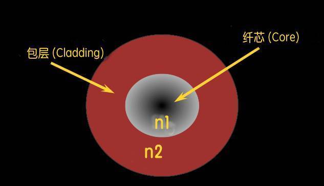 n1=纖芯折射率;n2=包層折射率,n1>n2,形成形成全反射條件。