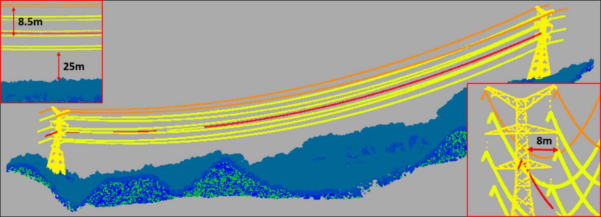 電力線走廊數(shù)字化重建后,即可得在電腦中直觀立體顯示電力線、電塔的位置、與走廊地物的空間關(guān)系;結(jié)合桿塔上安裝的溫度、濕度、風(fēng)速等監(jiān)控設(shè)備傳回的數(shù)據(jù),即可在三維數(shù)字化電網(wǎng)基礎(chǔ)上進(jìn)行各種電力作業(yè)分析,如預(yù)測(cè)與模擬不同溫度、風(fēng)速、覆冰下弧垂變化情況,模擬樹(shù)木生長(zhǎng)情況等。圖11中紅色點(diǎn)表示某些狀態(tài)下可能會(huì)對(duì)電力線安全構(gòu)成威脅的植被點(diǎn),圖12中藍(lán)色點(diǎn)表示樹(shù)木在生長(zhǎng)一段時(shí)間后可能會(huì)對(duì)電力線安全產(chǎn)生威脅的植被點(diǎn)(PLS-CADD)。