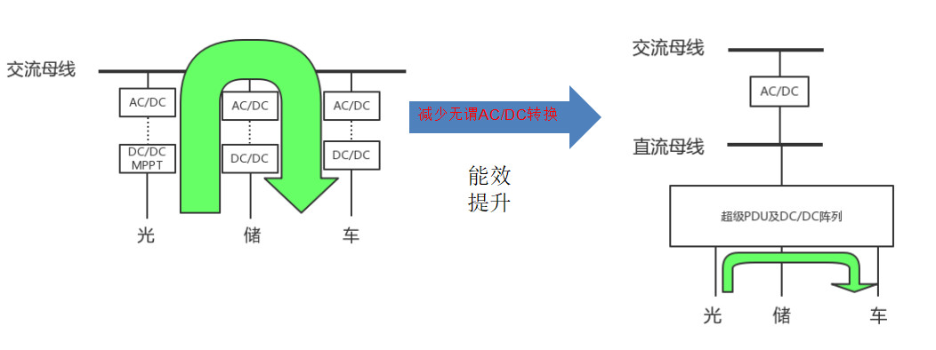 以光伏系統(tǒng)為例,光伏出來的都是直流電,通過DC/DC的電壓變換,然后做DC/AC掛到交流母線上。儲(chǔ)能也是通過直流變交流掛到網(wǎng)上。將光伏發(fā)電傳送到車上的時(shí)候,不但要把直流變成交流,還要再把交流變成直流,這樣能量就會(huì)有無謂的損失。上圖中右側(cè)是直流微網(wǎng)的架構(gòu),把光伏、儲(chǔ)能和汽車都直接并在直流側(cè),用一個(gè)超級(jí)PDU做能量的分配,實(shí)現(xiàn)在直流端能量的直接的相互的流動(dòng)。