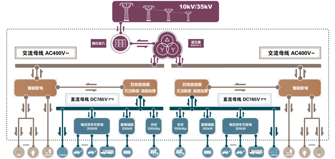 上圖是某園區(qū)微網(wǎng)的示意圖。上圖藍(lán)色的部分是直流母線,用的是1250的雙分裂變壓器,每邊掛的負(fù)載都是對(duì)稱的,每一條母線上掛了500kw的光伏,200kw的儲(chǔ)能,以及功率為200kw的電動(dòng)汽車充放電的系統(tǒng),并且還掛載了一些直流負(fù)載,這樣就形成了一個(gè)自治的小的直流微網(wǎng),再通過雙向變換器與交流側(cè)做能量的變換,這樣就實(shí)現(xiàn)了很大一部分能量的自治,例如白天光伏發(fā)的電可以直接儲(chǔ)能給電動(dòng)汽車充電,在白天用電負(fù)荷比較大的時(shí)候汽車放電,在直流側(cè)需要能量或者能量多余的時(shí)候就可以通過AC/DC的雙向變換器,或者叫四象限模塊,連接到交流側(cè)配網(wǎng),把電送到交流側(cè)或者從交流側(cè)取電,減少?gòu)拇箅娋W(wǎng)的取電,實(shí)現(xiàn)小區(qū)域的自治。